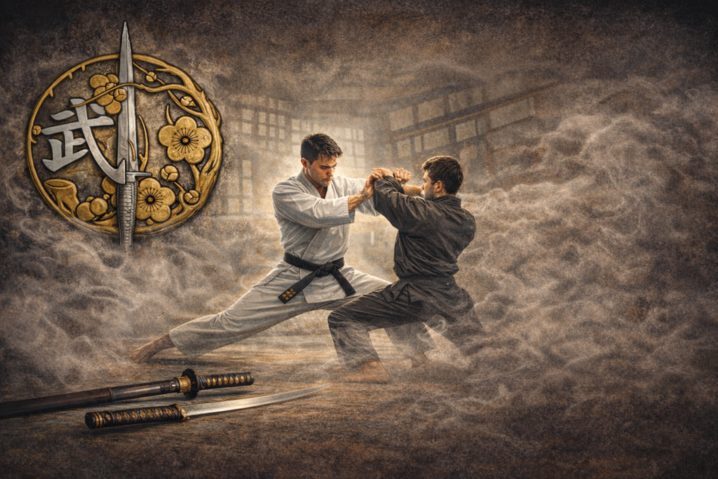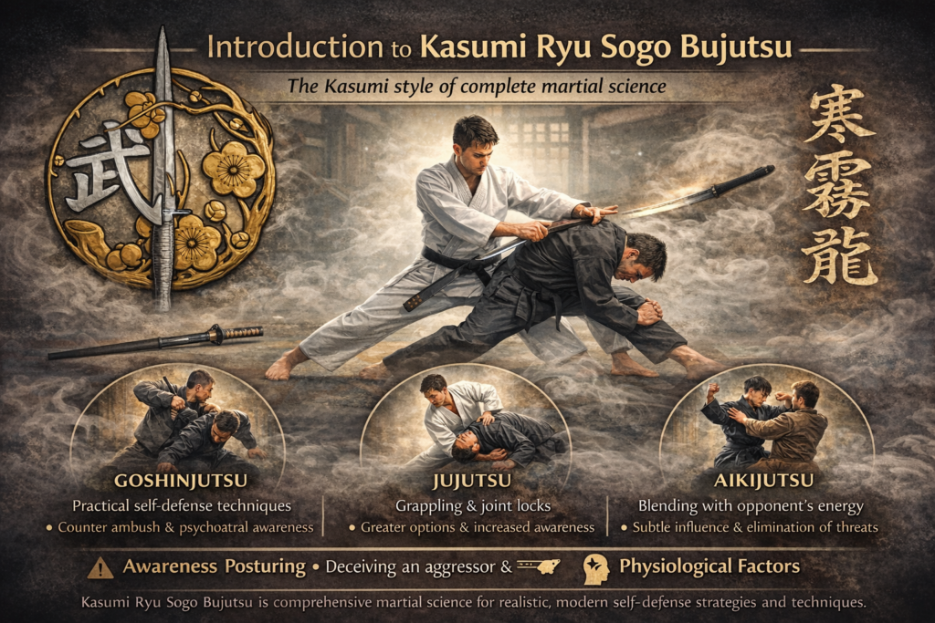 Introduction Kasumi Ryu Sogo Bujutsu, the Kasumi style of complete martial science. Kasumi is a mist, and alludes to an elusive nature which the student strives for.  This effect is achieved through mastery of timing, distance, balance, and blending with an opponent’s energy.   Kasumi Ryu teaches three components of martial science. Goshinjutsu are the… Read more: Introduction