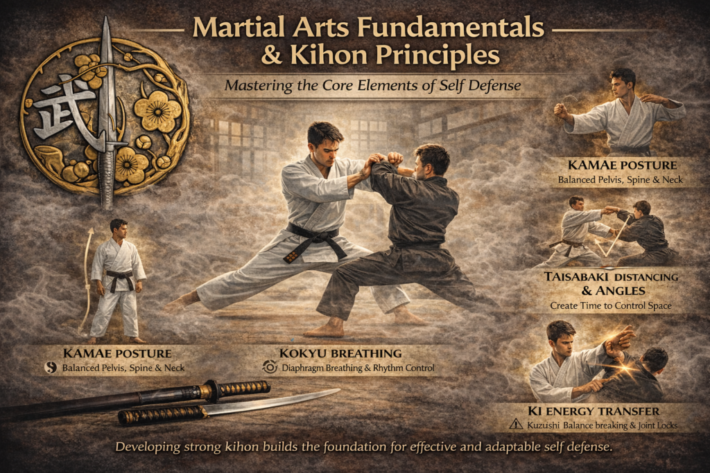 Fundamentals Kihon, are the fundamentals that apply to every aspect of the art, including posture, breath, distancing,  angling, timing, circumnavigation, triangulation, energy transfer, and communitive locking. Proper kamae (posture), is essential to the successful application of martial arts.  It begins with a naturally erect spine and neck that properly balances the head, and shoulders over… Read more: Fundamentals